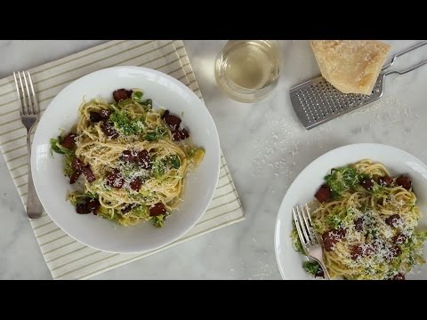 Join Sarah Carey as she takes you through a recipe for spaghetti that gets a whole lot more flavorful with the addition of braised Brussels sprouts and crisped bacon.