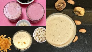 Kaju Draksh (cashew raisin) Milkshake, Badam Anjeer (almond fig) Milkshake, Almond cherry smoothie milkshake recipes for fasting and weight watching.